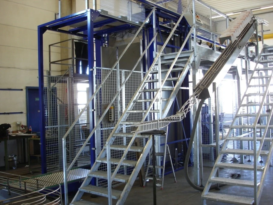 Likewise, the mechanical engineering of the palletizer and depalletizer amongst others according to the special conditions in the production halls or according to the desired level of technical equipment of the system, such as manual, partially or fully automatic control.